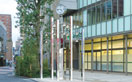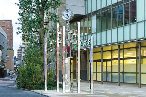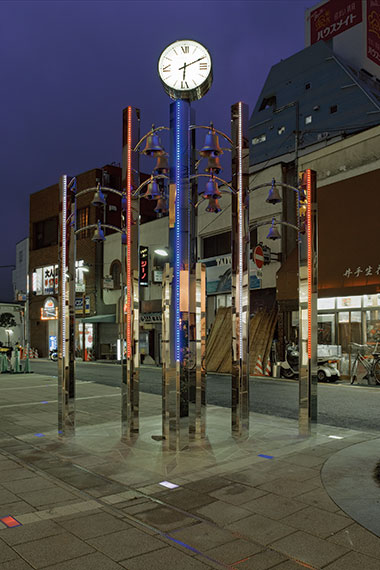 JR常磐線金町駅前の施工区域面積約12,000平方メートルという広大な駅前区画で進められていた「金町六丁目地区第一種市街地再開発事業」に伴い、2009年6月、「ヴィナシス金町」が誕生しました。地上41階建て、高さ138mの超高層タワーで、スーパーマーケットやショッピングモール、図書館、クリニック、マンションなどを内包した複合施設となっています。この「ヴィナシス金町」のメインエントランス付近、北側広場にパブリックアートとしてカリヨンが設置されました。日本語で組み鐘と訳されるカリヨンは、調律された複数の鐘でメロディが演奏出来るものをいい、発祥は14世紀のベルギー、オランダに遡ります。金町という地名、また再開発地区に隣接し、ベルシティとして地域の方々に親しまれてきた南口のすずらん通り商店街にちなむ、新しい街並みのシンボルアートです。周りの景色が映り込む鏡面仕上げのカリヨンアートは、周辺に威圧感を与えないすっきりとしたデザインで、鐘の部分はオランダ製、それを制御するコンピュータはベルギー製となっています。