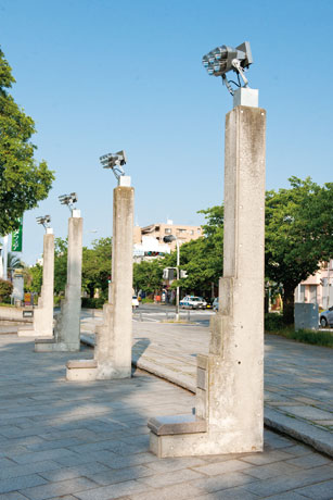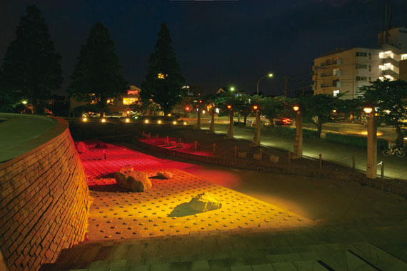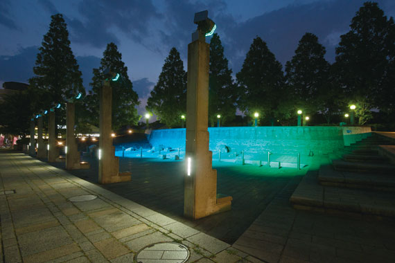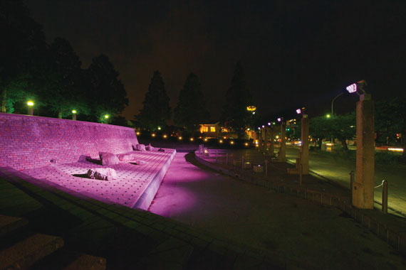 横浜市中区の新本牧公園は、敷地面積約14,700m²という広さを持つ細長い形の公園です。閑静な住宅街の一角にあり、春の桜や秋の紅葉など、四季折々の自然や散策を楽しむことができる公園として、地域の方々に親しまれています。横浜市環境創造局公園緑地整備課では2013年3月、本牧通りに面した場所にある水景施設の改修工事を実施し、モニュメント的な佇まいの既設照明柱に、新たにLEDフルカラー投光器と特注足元灯を設置しました。水が流れる人工の循環池に光を照射し、季節やイベントに合わせて光色を変化させることで、カラフルに季節感を演出しています。