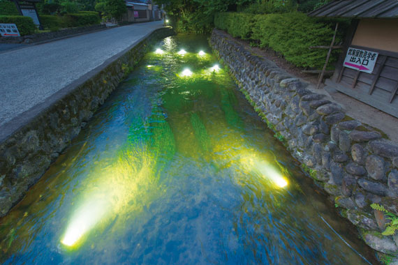 水中に咲く可憐な梅花藻をLED照明で照らし出し、城下町白石の風情ある佇まいを魅力的に演出