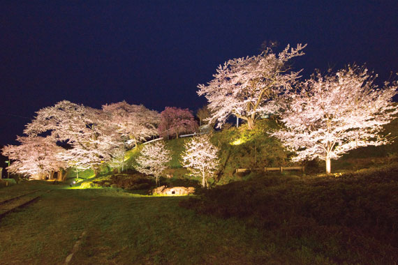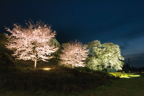 ライトアップ用のLED投光器は、桜の淡いピンク色をより綺麗に演出するため、「美vidレディオック フラッド ネオ 白色」を使用しています。サンプル提供で「レディオック フラッド ネオ一般形(5000K)」も設置しているため、双方を比較すると美vid形白色では色の再現性がより高いことが実感できました。また、バラストホッパーの遺構(石垣)部分を「美vidレディオック フラッド ネオ 電球色」で照明することで、歴史を感じさせる情緒ある佇まいを効果的に演出しています。