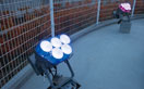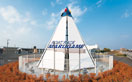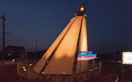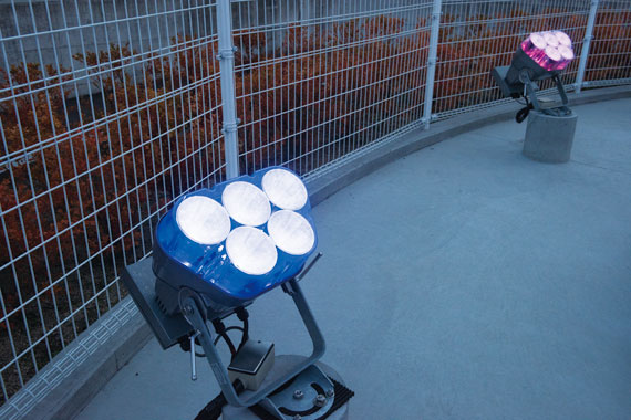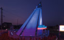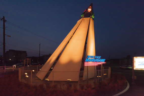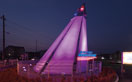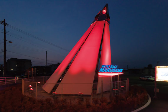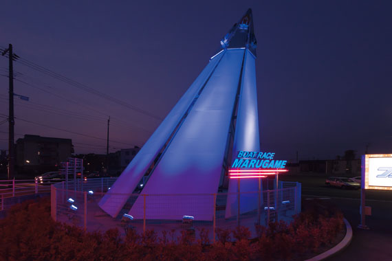 ボートレースの「迫力」、「疾走感」、「高揚感」をコンセプトに設計された新しいシンボルタワーは、偏芯三角錐の形状の6面に白いテント生地を張り上げたスタイリッシュな造形となっています。また、シンボルタワーを上空から見ると丸亀市の特産品である「うちわ」を表すデザインであることも特長の一つです。このシンボルタワーは夜になるとライトアップされ、幻想的な雰囲気を演出しています。ライトアップの光源にはLED投光器(レディオック フラッド ブリッツ フルカラー100Wタイプ)をご採用いただき、各面2灯、合計12灯配置しました。