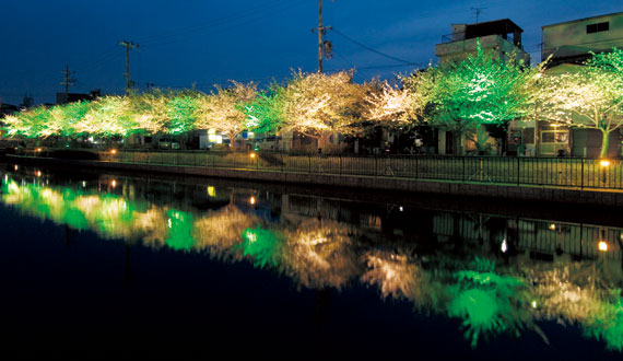 堺市の中心部を流れる内川・土居川は、400年にわたり堺のまちを見守ってきた川です。総延長4.72kmの川には遊歩道が整備され、春には川沿いに桜並木が咲き誇り、3月末から4月の初めにかけて、桜まつりの開催とともに内川河川敷(ザビエル公園西側)の桜ライトアップが実施されました。