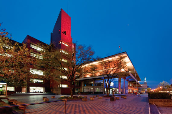 垂直に上昇する階段室塔屋部を赤色の光で強調するとともに、深い軒先を暖色系の光で照らし、赤レンガ壁と調和させながら浮かび上がらせています。また、入口ピロティの天井を青色の光で強調し、景観のアクセントとしました。