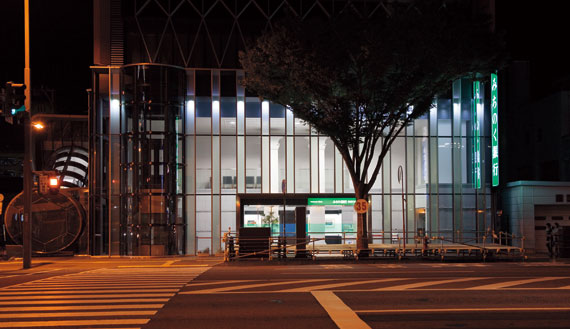 Myリストに追加青森市の国道4号線沿いに位置する、みちのく国道ビルは1階、2階部分がみちのく銀行国道支店となっています。省エネ・CO₂排出量削減・省メンテを重視した設計コンセプトに呼応する照明として、1階及び2階吹き抜けエリアの壁面照明にはLED投光器(レディオック フラッド ポケット)が採用されました。ビルの内面側から外壁面を照らすことにより、通行車両、歩行者へのグレアを抑え、必要なエリアを効果的にライトアップしています。