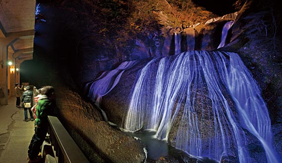 大子町では、これまでも秋冬にライトアップを行ってきましたが、2010年より、全国初となるLEDによる滝のライトアップを始めました。〈奥久慈袋田滝紀行 美観の秋・荘厳の冬〉と称し、昼景とは異なる優美で幻想的な夜の滝の魅力を光で演出、県内外から訪れる多くの観光客を魅了しました。指向性が強く配光制御が容易なLEDを使用することで、効率よく必要な場所だけを照射し、環境に配慮した照明演出を実施。大岸壁を流れる水の白さを強調し、光の強弱により滝の奥行き感を演出するとともに、白色光、電球色光、青色光のLED投光器を使い分け、荘厳で神秘的な雰囲気をつくり出しました。