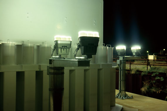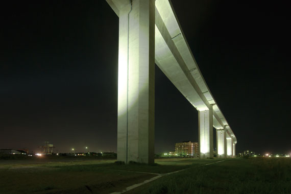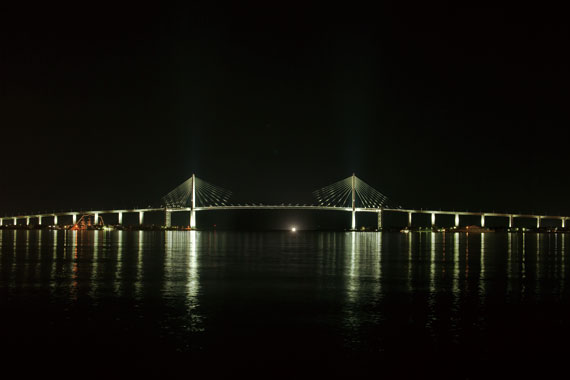 約1年前に高出力LED投光器の採用を決定し、現場での点灯実験を経て導入に至りました。橋梁主塔部、ケーブルのライトアップは国土交通省、東西のアプローチ部ライトアップは射水市が施工し、2012年12月より富山県・射水市の管理のもとで実施をしています。射水市の新しいシンボルとして新湊大橋が親しまれ、多くの方々にご利用いただけることを願っています。