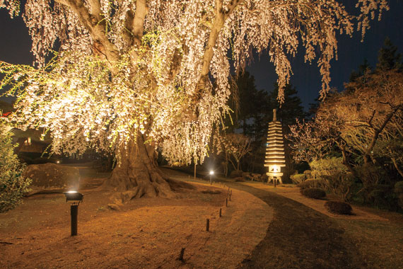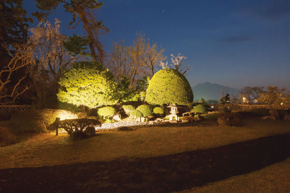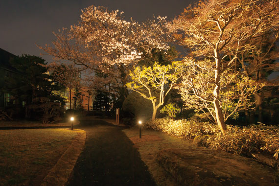 照明の光源は省エネ及び環境に配慮しLEDを使用しています。また、すでにライトアップされている洋館は、建物の特徴的な部分のみを照らし、八角屋根が闇との対比で印象的に浮かび上がるように演出してあり、本計画のテーマに合致するものとなっています。藤田記念庭園の開園期間は4月中旬から11月後半までで通常は午後5時までですが、さくらまつりの時期は夜9時まで開園していて、そのほかの時期もさまざまなイベントが催され夜間も開園する予定となっています。これからもより多くの皆さまに訪れていただけることを願っています。