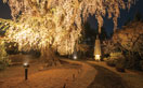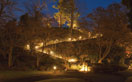 藤田記念庭園園内の照明計画については、「陰翳礼讃」闇の深さに浸透する光をテーマとし、動線の安全性に配慮しつつ、庭園の主要素を光と影で演出し幽玄味のある幻想的景観を創出するものとしました。園路照明については安全で美しい照明環境とするために、庭園入口部は竹塀を照らして、その間接光で入口廻りのあかりをつくり出しています。園路は昼間の景観にも配慮し、低位置に竹灯篭イメージのアプローチライトを等間隔に配置して、動線の足元が薄明りでつながるようにしました。階段部には手摺の外側にスポットライトを配置し、まぶしさを抑え階段踏面のみを照らして安全性を確保しています。庭園の演出照明については、庭園を形成する建物や灯籠、枯山水、滝、湿地、中島、池泉汀、橋、大枝垂れなどを印象的に照らし、周遊する楽しさをつくり出すとともに、庭園全体で程よい明るさを確保し、安全で安心できる空間としました。設計の基本方針として、園路照明は平均照度を薄明りの0.5ルクス程度とし庭園の光の景観を妨げないようにする、各演出照明はまぶしさを抑え極力目立たない位置に配置する、光源の色温度は3000K(電球色)とする、など「陰翳礼讃」というコンセプトに相応しい情緒溢れる光の景観となるよう、十分留意しました。