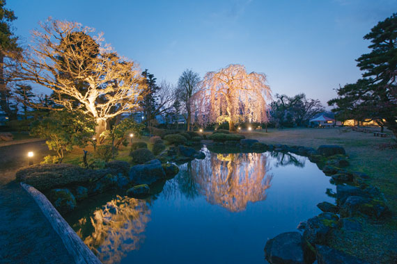 藤田記念庭園は、日本商工会議所初代会頭の藤田謙一氏が郷里弘前に別邸を構える際に、東京から庭師を招いてつくらせた大規模な日本庭園です。その後、弘前市が市政百年記念事業として整備し、1991年に開園しました。総面積約21,800m²と、東北地方でも有数の大きな庭園で、園内は高さ13mの崖地をはさんで高台部と低地部に分かれています。高台部は名峰岩木山を眺望する借景式庭園となっていて、別邸である洋館と藤田氏の本宅であった和館が建っています。崖地には滝石が組まれていて、その下に広がる低地部は池泉回遊式庭園となっており池泉を中心に中島、茶屋、東屋、築山などが配置され、静寂で枯淡な風情を見せています。