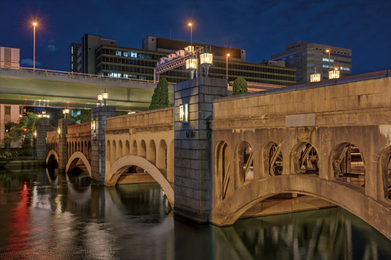 周囲景観と調和を図った各橋梁の演出を実現するため、現場での実証実験を重ね、プロジェクションフード(矩形配光をつくるための遮光フード)を開発。LED投光器「レディオック フラッド スポラート」と組合せ、橋梁以外への漏れ光を極力抑え、歩行者にまぶしさを感じさせず、ポイントとなるアーチ部分のみを明るく照らし出す照明演出を実現しました。水晶橋の親柱灯は器具が劣化していたので、青銅鋳物で復元してLED化を実施しました。現地実測をして設計を行い、地元の人々に親しまれている昭和の香りが漂うイメージを踏襲しつつ、光源にLEDランプを使用するとこで省エネを推進し、心地よい光環境を創出しています。