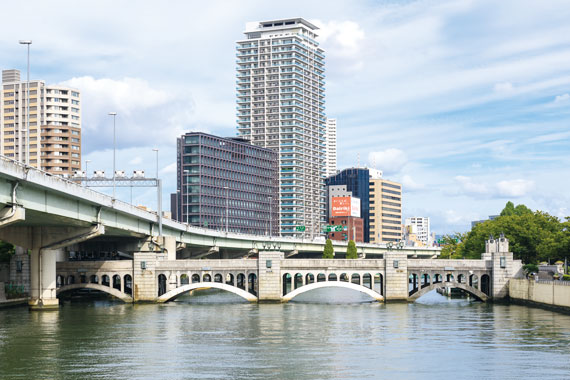 街並みに調和する電球色LEDの光で橋をライトアップし水都・大阪の夜間景観を魅力的に映し出す