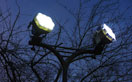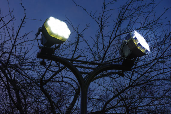 以前よりライトアップは行われていましたが、今回LED化工事を実施したことにより、建物の白壁もいっそう際立ち、幻想的な雰囲気を醸し出しています。LED化にあたっては、既設HID投光器に比べて照度アップを図りつつ、省エネを実現するライトアップを目指しました。既設の照明柱を使用してLED投光器(レディオック フラッド ブリッツ400W)を設置し、同じ位置で適切な照明になるように配光種類を慎重に検討しました。投光器は周囲環境との調和を考慮して指定色塗装(ダークブラウン)としています。また、西側には投光器がなかったため、現地を調査したうえで照明柱及びLED投光器を追加しました。照明柱を1基追加したことで、360度、街のどの方向からも城の夜景を眺めることができるようになり、山の上に浮かび上がる越前大野城が魅力的な夜間景観を創出しています。