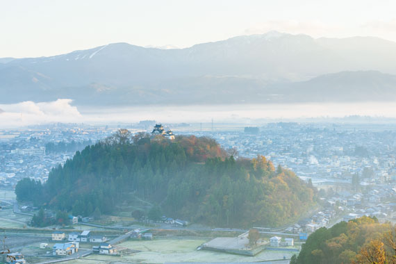 Myリストに追加「天空の城」のキャッチフレーズで近年注目を集めている越前大野城は、大野市の北西部に位置する大野盆地にある標高約249mの亀山に築かれた平山城です。織田信長の家臣・金森長近が天正3年(1575年)から築き始めた越前大野城は、明治維新後に破却されましたが、昭和43年に天守が再建され、大野市のシンボルとして親しまれています。春から秋にかけて、四方を山々に囲まれた大野盆地が朝霧に包まれると、雲海に浮かび上がる「天空の城 越前大野城」が現れます。