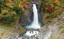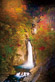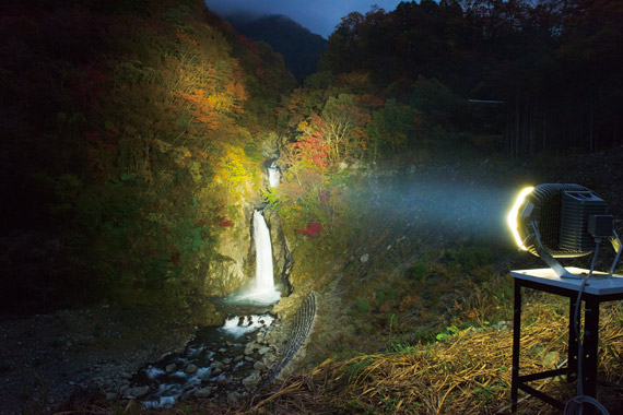 高出力形LED投光器で100m離れた場所から照らし、紅葉を背景に浮かび上がる滝の幻想的な光景を演出