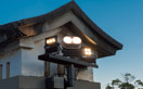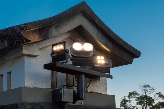 入母屋のライトアップは、LED投光器「レディオック フラッド ネオ80W」による広がりのある光と、高出力形LED投光器「レディオック フラッド ブリッツ80W」の集光したスポットライトを組合せることで光の濃淡をつくり、屋根飾りの鴟尾をはじめとした特徴的な屋根の造りを美しく演出しました。また、入母屋の奥行きを利用してLEDライン照明「レディオック 防湿形ラインユニット」を設置し、三角形状の漆喰壁を明るく照らし出し、景観にアクセントを与えています。照明器具は存在感を抑えたコンパクトな器具を使用し、全て統一した景観色で塗装。設置場所を最低限に集約することで、日中の景観にも十分配慮した照明配置計画を行いました。
