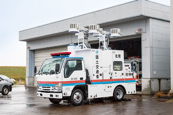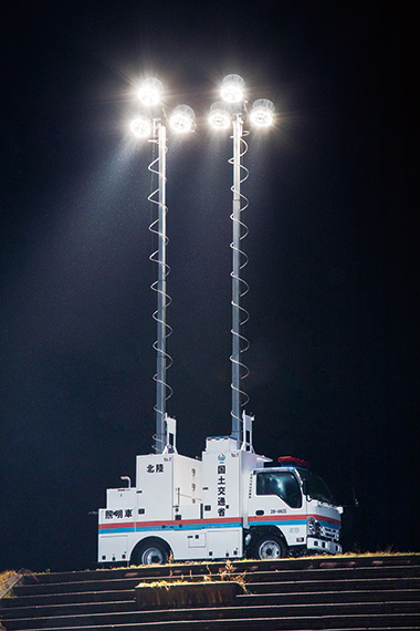 Myリストに追加国土交通省 北陸地方整備局では、災害復旧活動を円滑に支援するための資材及び災害対策用機械を保有しています。災害対策用機械である照明車は、台風や集中豪雨、地震などにより河川、道路などに災害が発生した場合、一刻も早い復旧工事、支援活動及び監視を行うため昼夜連続の作業が必要となるため、夜間作業時に災害現場を明るく照らす役割を果たしています。従来はショートアークメタルハライドランプ2000W×6灯を使用していましたが、2016年12月、同等の出力を1300Wタイプで出せるLED投光器「レディオック フラッド デュエル」に更新しました。