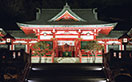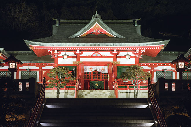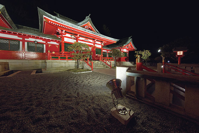 遷宮80年を迎えた2017年には記念事業の一環として、社殿の塗装工事を行い、赤色から鮮やかな朱色に化粧直しをいたしました。また、かねてより実施している社殿のライトアップについては、既設水銀ランプに替えて、高効率・長寿命のLED投光器「レディオック フラッド スポラート」を設置し、大幅な省エネを実現させつつ明るさを向上させました。朱色と銅屋根の緑青が美しいコントラストを見せる社殿を厳かに照らし出し、昼間とは異なる幻想的な雰囲気をつくり出しています。