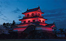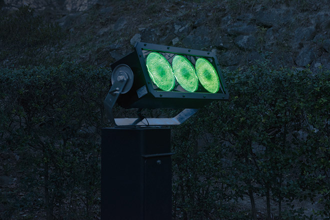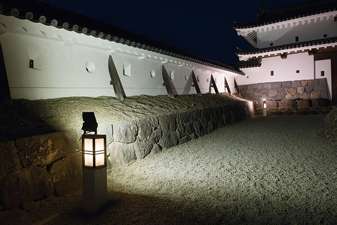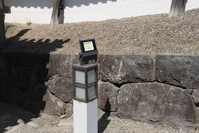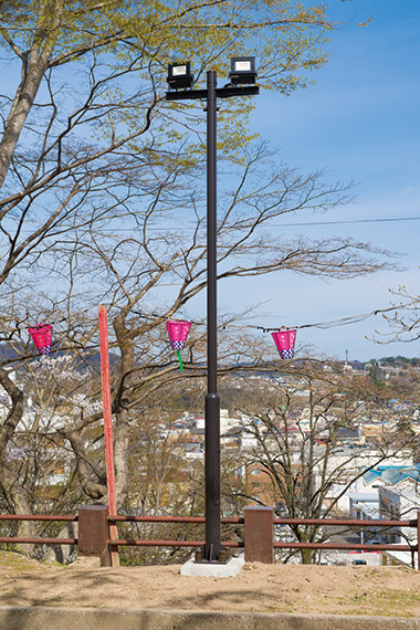 今回の照明設計の意図として、白石城、ひいては白石市を賑やかにしたいというコンセプトのもと、天守閣のライトアップと桜のライトアップの2点に重点を置き、照明設計を行いました。白石城天守閣では、特別なイベント時にはフルカラーLED投光器を使用して光色を変化させることにより、通常の白色のライトアップとは異なる姿が見られるようにしています。白石城の天守閣を1面あたり2灯ずつ4面全てをライトアップすることで、どの方向から見ても色の変化を感じることが出来るようになっています。桜のライトアップに関しては、鮮やかで自然な色味を再現するLED投光器「美vid レディオック フラッド ネオ」を使用し、白壁などその他の箇所にはLED投光器「レディオック フラッド ネオ」を使用することで、より桜が際立つように配慮しています。ライトアップをする場所が天守閣ということもあり、設計する際に現地にLED投光器のサンプル照明器具を持ち込み、取付角度、仕様(出力タイプ)を何度も変えて見え方の実験を行ったことで明る過ぎない光とし、歴史を永代に伝える天守閣に調和する景観演出照明ができました。