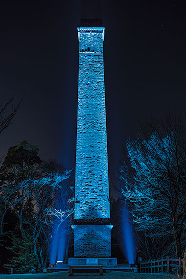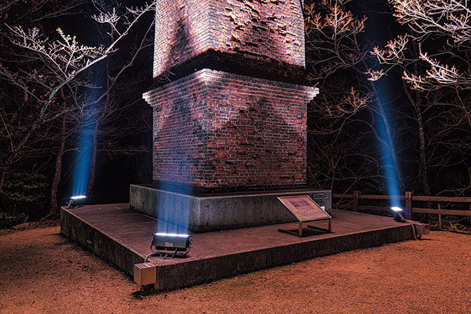新居浜市では、市民の方々に“えんとつ山"の愛称で親しまれている旧山根製錬所煙突を照らし出すライトアップを、2021年4月より始めました。旧山根製錬所煙突は、山根競技場の南に位置する生子山(標高144.7m)の頂上にある四角形平面の煉瓦造煙突です。低品位鉱の有効利用を図るために築かれた製錬所施設の一部であり、別子鉱山における事業発展の歴史を示す地域のシンボルとなっています。1888年に完成し、2009年には国の登録有形文化財に登録されています。