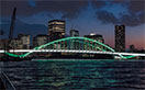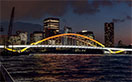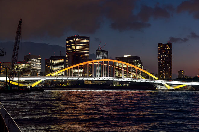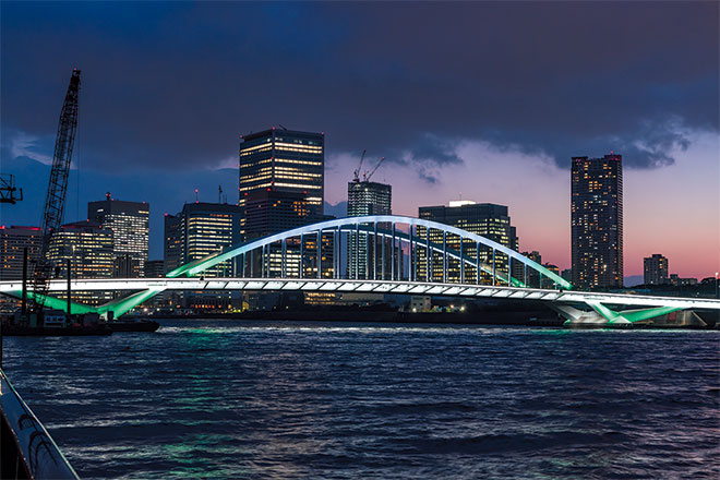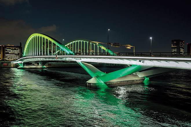 隅田川の新しいゲートにふさわしく、大アーチを鮮やかなカラーで彩り、ゆるやかにカーブする橋桁を優しい白色光で照らし出しています。毎正時には、カラーで照らされた大アーチを上から下へゆっくり白色に変化させるなど、より多彩な演出を行っています。最先端の光と制御技術を用いて実現した最新のライトアップです。
