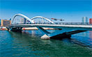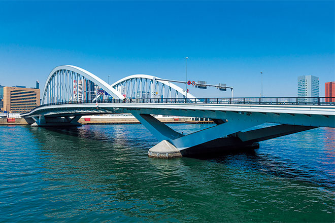 隅田川の最も下流にあり最も新しい橋、築地大橋は、アーチを外側に傾斜させ、上横支材のない開放的で斬新なデザインの鋼3径間連続中路式アーチ橋です。