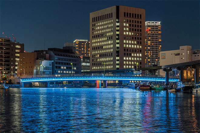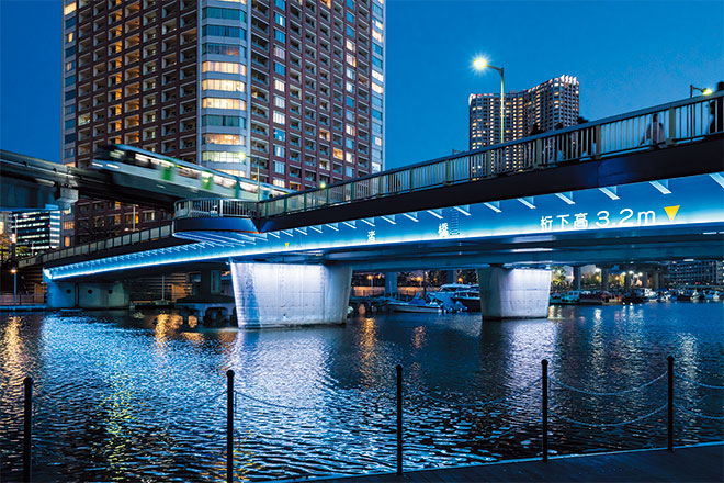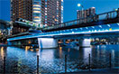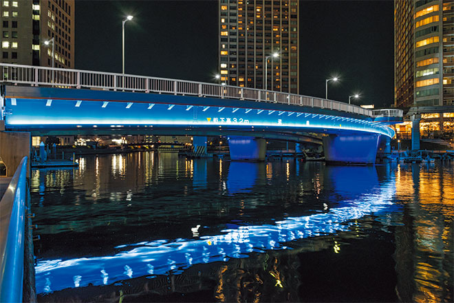 港区では、この地区の貴重な地域資源である水辺空間の魅力をさらに向上させ、地域コミュニティや観光・産業の活性化を図るため、橋りょうやモニュメントなどをライトアップする事業を進めています。各橋りょうの特徴に合わせて、橋桁の外観色をいかす白色光による照射をベースに、桁裏などの部位とのコンビネーションを水面に映し出し、個性を引き出しています。橋脚や橋台へのカラーライトアップは、平日、週末、祝日、桜の時季やクリスマス、イベントなどイメージに合わせて光色を変化させることができ、彩り豊かな夜間景観を創出しています。
