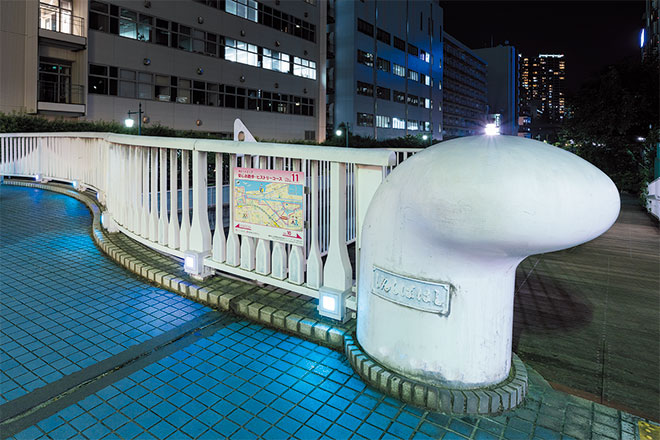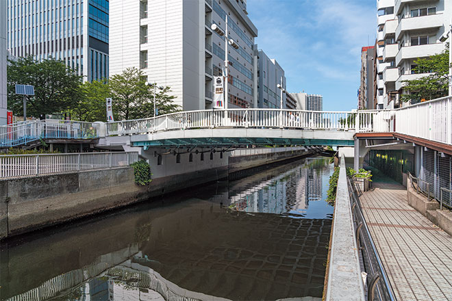 JR田町駅最寄りの新芝橋は、なぎさ通りの渚橋へと続く橋りょうで、旧町名の新芝町に架けられたことを名前の由来としています。ビジネス街でもある田町周辺の主要な道路として多くの人々が行き交う新芝橋の中央部には、外側に向けて半月形のスペースが設けられ、運河や往来する舟を眺めることもできます。新芝橋は、駅から運河へ向かう動線上の橋りょうとしてライトアップされていて、運河沿いに整備された遊歩道や水辺空間の魅力を向上させ、良好な景観を形成しています。