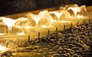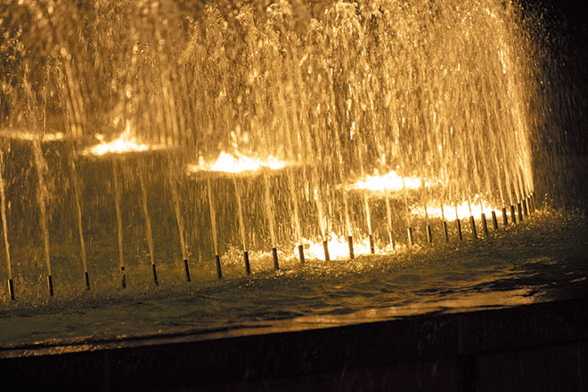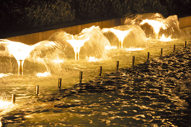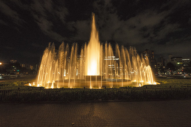 慰霊と恒久平和への願いが込められた噴水を温もりのある光でライトアップ