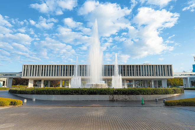 広島市の中心部にある平和記念公園は、原爆死没者の慰霊と世界恒久平和を祈念して開設された都市公園です。園内には世界遺産に登録されている原爆ドームや、原爆投下時の広島の様子を展示した広島平和記念資料館、原爆死没者慰霊碑(広島平和都市記念碑)、国立広島原爆死没者追悼平和祈念館、広島国際会議場、平和の願いを込めて設置された数々のモニュメント、被爆したアオギリなどがあります。広島平和記念資料館本館の南側の広場に位置する「祈りの泉」は、「水を水を」と言いながら亡くなった原爆犠牲者の御霊に捧げ、慰霊の気持ちを込めて1964年に建設された噴水です。原爆ドームと原爆死没者慰霊碑とを見通すことのできる直線上にあり、東西27m、南北19mの長円形で、567本の噴水口から毎分11トンの水を10mの高さまで噴き上げています。