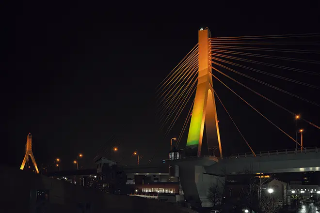 2025年に青森港は開港400周年を迎えます。これに伴い、ベイエリアのシンボルである青森ベイブリッジに注目が集まることが見込まれることから、青森県では2025年4月より主塔のライトアップを開始しました。ライトアップに先立ち、維持管理や環境負荷の低減を考慮し、投光器をLEDに更新する改修工事が実施され、多彩な色の光を自在に表現できるフルカラーLED投光器「レディオック フラッド フルカラー」をご採用いただきました。