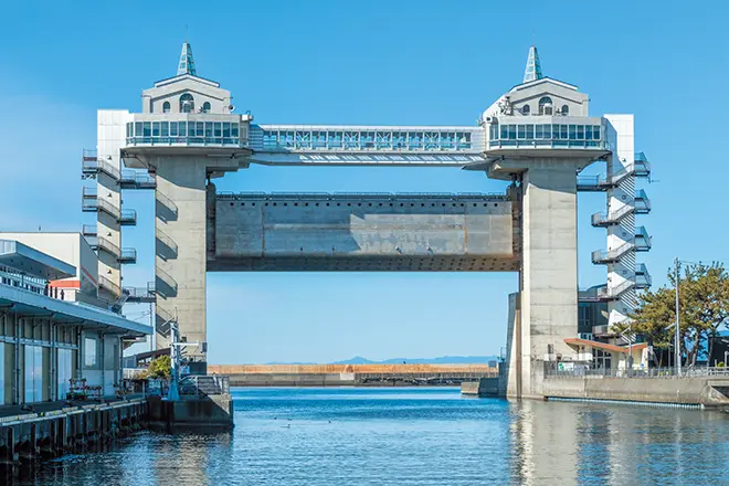 沼津港大型展望水門「びゅうお」は、東海地震の津波対策の一環として2004年、沼津港に完成した大型水門です。津波を防ぐ扉体は、幅40m、高さ9.3m、重量は406tと日本最大級で、地震計と連動した制御設備により、地震発生後約5分で自動的に完全封鎖されます。水門にはその高さをいかして地上30mのところに展望施設が併設されていて、富士山や箱根連山、沼津アルプスをはじめ、駿河湾に突き出した大瀬崎をくっきりとのぞむことができるほか、魚市場の活気ある様子や往来する船、また水門の心臓部である巻上機などを間近で見ることができます。夜間には水門の壁面を照らし出すライトアップが行われ、沼津港のシンボルとしての存在感をさらに高めています。