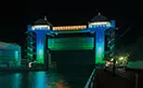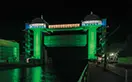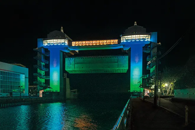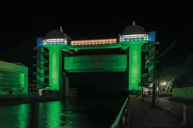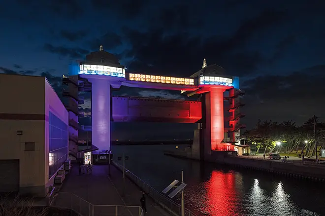 沼津港のシンボルとして親しまれている大型展望水門をより魅力的に照らす多彩な光の演出