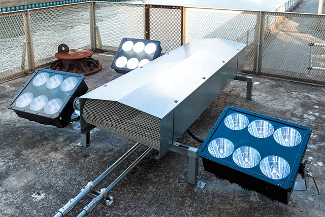 沼津市では、既設HID投光器でのライトアップ照明の老朽化に伴い2025年1月に照明改修を行い、省エネ推進などの観点からLED照明に更新しました。改修にあたっては、あらかじめLED投光器を現地に設置して色味を詳細に確認するとともに、近くに住宅があることから周辺への漏れ光にも留意した配灯位置の確認などの照明実験を行ったうえで、多彩な色の光を自在に表現できるフルカラーLED投光器「レディオック フラッド フルカラー」を採用しました。全体をDMX制御システムにより連携させることで、明暗やグラデーション、点滅などを組合せ、細やかな制御による表現を可能にしています。
