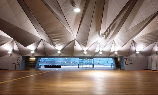 Myリストに追加屋内外をウッドデッキで構成し連続性を持たせ、天井は柱や梁のない折り紙状になっているのが特徴のひとつです。視野が広く一体感のある内部の照明は、メタルハライドランプによるグレアの少ない間接照明を採用し、広がりのある光空間を創っています。また、奥行き・照度のバランスを考え適切な所に個別照明を行っています。