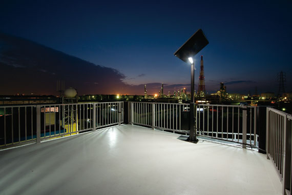 さらに当社大阪製造所内にも、所員の避難施設としてSGタワーを建設し、2013年1月に完成しました。今後、仙台製造所と同様に周辺住民の避難施設として供すべく提案する予定です。東日本大震災以降、防災に対する意識、備えの志向も高まり、北海道から九州の太平洋沿岸を中心に、SGタワーの必要性が一層高まるものと予想されます。「安全・安心」、「エコ」、「優れた機能・デザイン性」を特徴とし、被災経験をいかしSGタワーに備えられた「太陽光発電照明柱/スミポールそらてらす」は、停電時、夜間の道しるべとなる極めて重要な設備です。