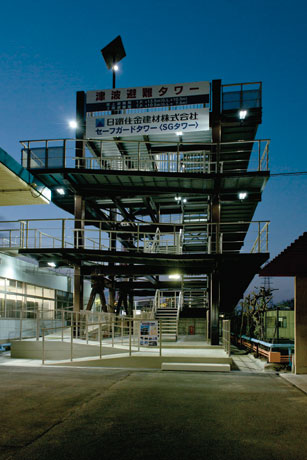 東日本大震災では、当社仙台製造所も津波の被害を受け、壊滅的な打撃を受けましたが、津波襲来時、所内の筑山に所員、所内協力会社員、及び周辺住民の計130名以上が避難し、幸い全員無事でした。一方、津波により、多くの建築物が被害を受けましたが、コラム-H構造(鉄骨造)の建物は損傷が少なく、その性能の高さが改めて確認、評価されました。コラム材(冷間成形角形鋼管柱)のトップメーカーとして有している鉄骨造に関する多くのノウハウを基盤に、津波の被災経験をいかして、非常用電源設備や災害用備蓄品の収納など、さまざまなアイデアを織り込んで、今後予想される巨大地震に対する防災対策となる商品として津波避難タワー(SGタワー)を開発しました。2012年5月に第一号を仙台製造所内に建設し、以後、全国の行政、住民、企業、学校など1,300名を超える方々が見学されています。また、静岡県袋井市様に採用して頂き、2012年12月に竣工しています。引き続き、三重県御浜町様にも採用され、現在工事中です。