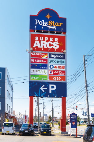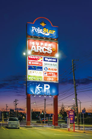 ポールスターショッピングセンターでは、2014年11月、施設入口のサインポールの照明を既存ハロゲンランプからLED照明に交換しました。北海道という地域性を考慮し冬場の積雪や環境温低気温をクリアできる器具、また既存投光器と近い意匠の投光器を提案し、既設アイ ハロゲンランプ500W×50台に替えて丸形LED投光器「レディオック フラッド エルエー(昼白色LED 40W)」×50台を採用いただきました。消費電力の大幅削減を実現しつつ、明るく均一に看板を照らし出しています。また、サイン面がブルーを基調としているため、LED照明の色温度は3000Kではなく5000Kをおすすめし、爽やかな光色でより効果的に見せています。