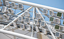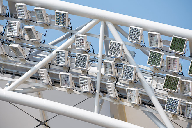 メインスタンドのネット裏を覆う、秋田名産の米粒を模した白い膜屋根と秋田竿灯まつりの竿灯をイメージした4基の照明塔が特徴的な球場では、2017年より大規模改修工事を実施し、2018年3月に終了、6月末にリニューアルオープンしました。今回の改修工事では、外野の芝生全面張替えや客席屋根再塗装などに併せてナイター用の照明塔、架台部分を改修するとともに照明の省エネ化を図る目的でLED化が実施されました。スタジアム完成から15年が経過し、日本海に隣接した施設であることから設備の腐食進行速度が速いため、腐食対策として照明器具は全てポリエステル塗装+フッ素塗装の重耐塩仕様としました。スタジアムの特徴となっている白い膜屋根に設置されている照明器具は、建築デザイン上取付高さが低いため、既設投光器ではグレアが課題となっていましたが、既設メタルハライドランプ1500Wに替えて、まぶしさを抑えた配光性能のLED投光器「レディオック フラッド ゼスト 800クラス」を設置することで、グレアを大幅に抑えることが出来ました。