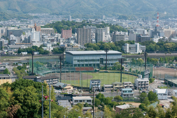 高知市の総合運動公園内にある高知球場(高知市野球場)は、内野部分が土、外野部分が天然芝で、両翼96m×センター120m、収容人員6,000人という規模を持つ野球場です。高知球場で2010年より進められてきた夜間照明設置工事が2012年春に完成し、県内初となるナイター設備が備えられました。照明方式はJIS基準に基づき6基制配置とし、45灯用(保安灯を含む)照明鉄塔の高さは33.5m(最下段30m)となっています。施設の近くに住宅地が控えているため周辺環境への光漏れに十分配慮のうえ、投光器は外付けルーバを取り付けた増反射膜付投光器(アクロスター)が採用されました。昆虫が好む光の波長を大幅にカットしたUVカット形メタルハライドランプ1500Wと、効率・光束維持率に優れ、長寿命の高圧ナトリウムランプ940Wとの混光照明で、演色性及び経済性を向上しています。設計照度は全点灯時において硬式・公式戦が可能な内野1500ℓx、外野800ℓxを確保。瞬時点灯が可能で消費電力が少なく、長寿命のLED200Wタイプを保安灯に使用しています。