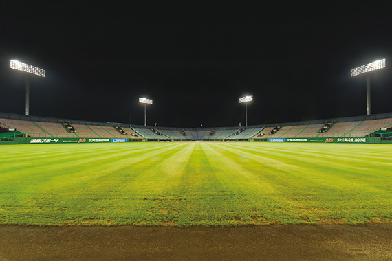 旭川市の花咲公園内にある硬式野球場は、プレーグランド面積13,300m²、両翼95m、センター120m、収容人数25,000人(内野10,000人・外野15,000人)という規模を誇り、旭川出身の大投手の名前にちなみスタルヒン球場という愛称で親しまれています。これまではナイター照明がなかったため、デーゲームで年間数試合のプロ野球を開催していましたが、2013年5月にナイター照明設備を設置。6月2日にはナイター照明点灯式とともに、北海道内初となるプロ野球の屋外ナイトゲーム、北海道日本ハムファイターズ対横浜DeNAベイスターズ戦が開催されました。北海道内のプロ野球公式戦が開催可能な野球場でナイター照明設備を備えているのは、屋外野球場としては初めてとなります。照明方式はJIS規格の6基制配置で、設計照度は全点灯時においてプロ野球開催可能なバッテリー間2500ℓx、内野2000ℓx、外野1200ℓxとしています。