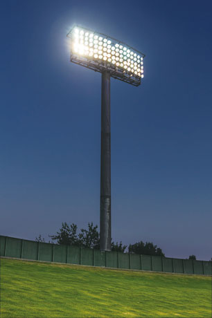 投光器は夜空の明るさへの影響、漏れ光に配慮のうえ、全て内蔵ルーバタイプとしました。また、ランプは、テレビ撮影を考慮して高効率形メタルハライドランプと高演色形メタルハライドランプの混光照明とし、平均演色評価数Ra80以上を確保しました。