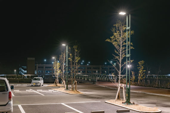 道路の両サイドに農学部の実験用圃場があることを考慮し、後方反射板、器具角度調整など後方への光害対策をしています。千鳥配列で88台設置されている「レディオック エリア アリビオ」特注器具も、深夜には50%調光する仕様で九州大学オリジナル色とし、環境に配慮した光で新しい道を安全に照らしています。また、理学系地区の総合研究棟南側周辺照明及び駐車場照明、渡り廊下照明についても、場所に応じて適切な照明器具が採用され、棟南側周辺照明を照らす照明器具には九州大学オリジナル器具の街路灯を設置。平均演色評価数:Ra95の演色性に優れた光で落ち着きのある夜間景観を演出しています。駐車場照明にも同様のオリジナルLED駐車場器具を、総合研究棟(理学系地区)内の渡り廊下にはLEDシーリングライト「レディオック シーリングⅡ」を配し、消費電力の削減と良好な照明環境を両立しています。九州大学では、新キャンパス計画のパブリック・デザインガイドラインに基づき、光環境では「防犯性」「安全性」を持つ機能照明に加え、演出照明によって「話題性」「ランドマーク性」のイメージ確立と、自然や植物の生態系を守るため人工光が周辺に漏れない配慮などをコンセプトとしています。