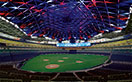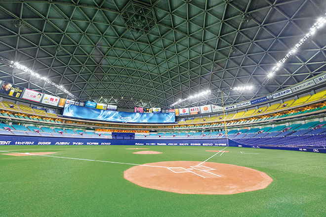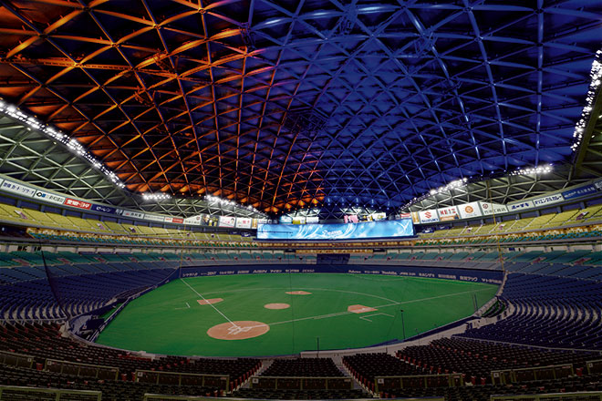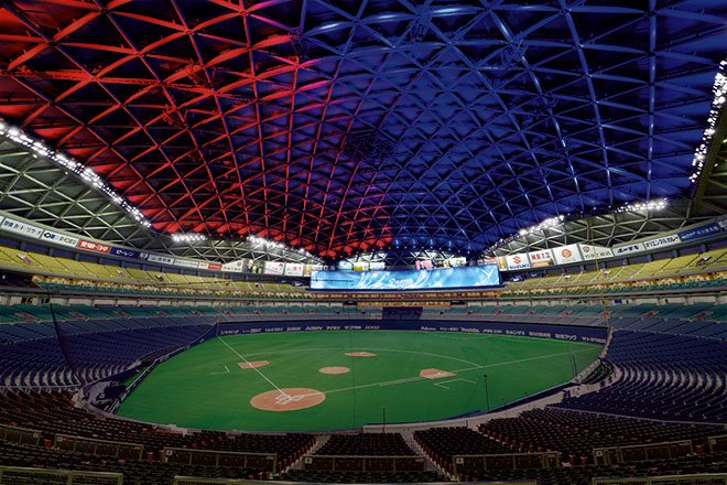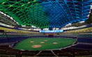 開場20年を迎えた2017年は、バックスクリーン「106ビジョン」の大型映像装置を増設し、2018年度は人工芝の全面張替に加え、アリーナのLED化改修を行いました。既存照明設備のフィールド照明を高演色形メタルハライドランプ投光器からLED照明器具に更新するにあたっては、LED照明の最大の懸念であったグレア(まぶしさ)についても十分配慮のうえ、選手への影響がないよう、各メーカーの器具を比較検討したうえで、岩崎電気の高効率・高演色形LED投光器「レディオック フラッド ゼスト」を選定しました。既設器具と比較しフィールド照明で162灯減灯となる570灯に更新することで、総消費電力の大幅削減を図ると同時に、器具台数を減らしながらプロ野球開催に必要な照度を確保し、空間照度や照度均斉度も向上しています。2018シーズンを終え、LED照明導入による消費電力比較は5割以上の削減を達成出来ており、また落雷による電圧降下で瞬時停電が起きた際もLED照明は瞬時再点灯が可能なため、試合を中断する心配も無用となるなど、一石二鳥ならぬ一石五鳥に値するくらいの効果を実感しています。さらに国内プロ野球の大型屋内スポーツ施設としては初となるDMX制御(DMX512-A※)による照明システムの採用により、フィールド照明を演出でも活用出来るようになり、ドラマティックな空間を実現しています。ドーム天井を照らすフルカラーLED投光器「レディオック フラッド フルカラー」102台と併せ、今までにない照明演出を可能にしました。フィールド照明、フルカラーLED照明は「106ビジョン」の映像と連動し、従来通りの映像装置の操作で、スタジアム全体の多彩な光演出を実現。よりダイナミックでエキサイティングな照明空間を創出しています。野球シーズン中は、ファンエンターテインメントの一環として、「グラウンドウォーク&スカイロールオープンショー」を週末のデーゲーム終了後に随時実施していました。お客さまが試合後のグラウンドに降りられるグラウンドウォークと合わせて、あかりが落ち、ドームの広大な天井の「スカイロール」がつくるさまざまな模様を寝転んで見上げることが出来るスカイロールオープンショーが好評をいただいていましたが、曇天や雨の日、スペシャルイベント時にはフルカラーLED投光器を効果的に使って、天井に現れるスカイロールの模様に彩りを添えました。今回のアリーナ照明LED化改修では、光によってその空間の雰囲気が変わることを実感するとともに、光の重要性を改めて感じました。これからもバンテリンドーム ナゴヤは時代と共に進化を続け、多くの皆さまに魅力を感じていただき、訪れていただける施設となるよう努力を続けてまいります。