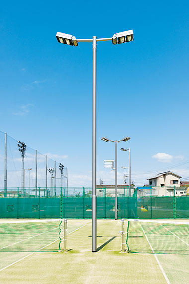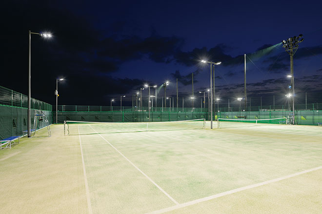 多目的グラウンドの照明設備に関しては、省エネ及びライフサイクルコストなどの観点からLED照明を採用し、サッカーグラウンドと野球グラウンドには高出力形LED投光器「レディオック フラッド デュエル 560Wタイプ」を、テニスコートには屋外テニスコート用に設計されたLED照明器具「レディオック テニスター 500Wタイプ」を使用しました。各競技の平均照度は、サッカーは200ℓx以上、野球は内野が300ℓx以上、外野が200ℓx以上、ソフトボールは内野が200ℓx以上、外野が100ℓx以上、そしてテニスは300ℓx以上とし、消費電力の削減に貢献しつつ十分な明るさを確保しています。