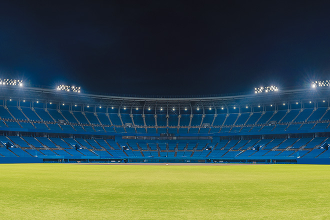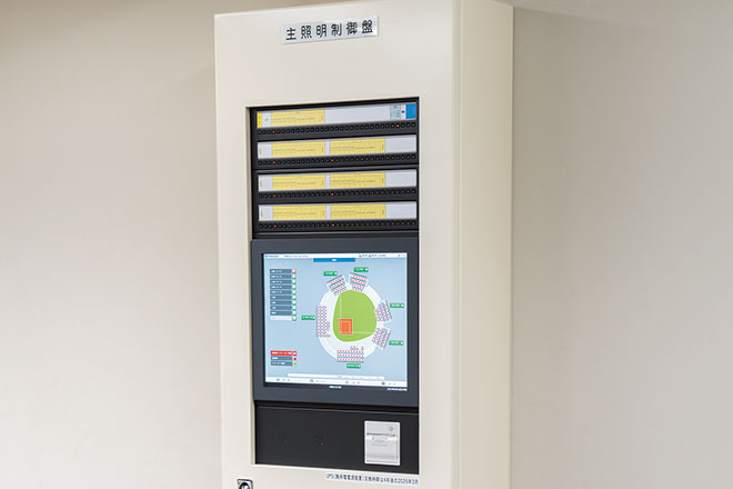 スタジアム照明のLED化にあたっては、投光器の振り向けにクロスエイミングの手法を採用し、野手・打者ともにプレーの妨げとなる照明塔上のグレアの塊を感じにくいよう配慮しました。また、3塁(レフト)側スタンドの周辺に民家があるため、1塁側のスタンド屋根上に設置した投光器の大半とライト側照明鉄塔の投光器全てをルーバ付とするなど、外部へ漏れる光の低減にも十分留意しました。照明制御については、プロ野球からレクリエーションまで目的に応じた照度設定を容易に行えるよう、液晶タッチパネルを採用した制御盤にリニューアルし、使いやすさも重視した良好な照明環境を実現しています。