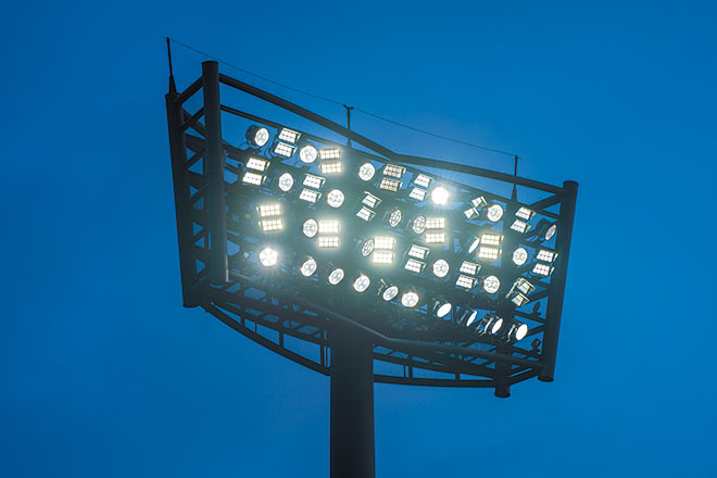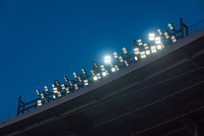 松山市では、省エネ化及びオールスターゲーム開催に向けて施設のリニューアルを実施中で、その一環としてナイター照明設備をLED化する更新工事を行い、2021年3月に完了しました。既設ショートアークメタルハライドランプ 2000W、メタルハライドランプ 1000Wに替えて、高出力LED投光器「レディオック フラッド デュエル 1300W」とグレア抑制に優れた高効率・高演色形LED投光器「レディオック フラッド ゼスト 1100クラス」に更新しました。2種類のLED投光器を用いて最適な配置を行うことで台数削減を図り、省エネを達成しつつ、プロ野球の開催に必要な照度レベルを満たすバッテリー間2500ℓx、内野2000ℓx、外野1500ℓxという平均照度を実現しています。特に外野1500ℓxは西日本の地方球場としては最高レベルとなっています。