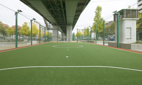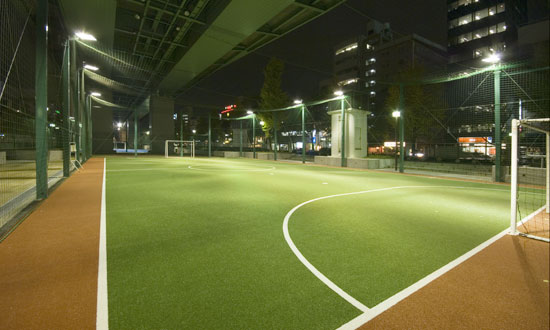 Myリストに追加名古屋市中区の若宮大通公園にある若宮フットサルパークは、公園の有効活用とスポーツを通してコミュニケーションの場の提供を目指し、ナイター設備やクラブハウスも完備しています。3500m²の敷地内に縦30m、横15mの人工芝2面を整備し、1面につき8台の器具を設置しました。平均照度は300ℓxの一般競技レベルの明るさを確保しています。