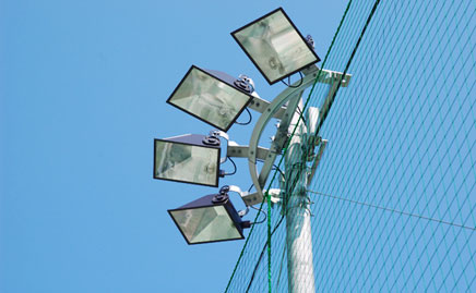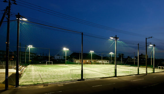 - ナイター照明は、一般投光器と水銀ランプによる照明から、フットサル専用投光器と高効率メタルハライドランプによる照明にリニューアルを行いました。住宅地が控えているため、プレイヤーへのグレアだけでなく光漏れを抑制する下方向照射型投光器を採用し、周辺環境にも十分配慮した照明としています。また、河川が近いこともあり、虫の好む光の波長をカットするUVカットコートのメタルハライドランプを採用しました。