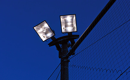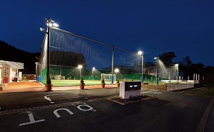 - 照明設備については、プラネタリウムのある佐賀県立宇宙科学館など近隣への光漏れの低減に配慮のうえ、フットサル専用照明器具が採用されました。下方向照射型投光器のため、プレーヤーへのグレアや上方向への漏れ光を抑制できること、高効率で節電につながり省エネにも貢献できることを特長としています。照明方式は1面コートごとにコーナー配置とし、1面あたり8台(2灯用×4台)を設置して十分な照度を確保しました。光源は演色性のよいメタルハライドランプを使用し、UVカット形とすることで虫の飛来を軽減しています。爽やかな光が効率的にコート内を照らし出し、夜間も安全・快適にプレーできる照明環境を提供しています。