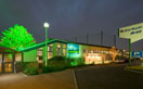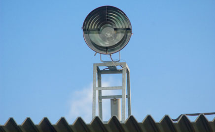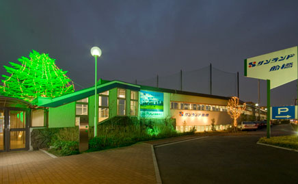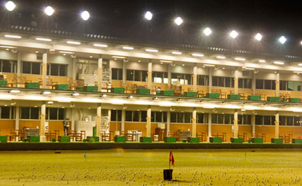 - 2006年11月に夜間照明のリニューアルが実施され、既設の投光器に加え、新たにアクロスターとメタルハライドランプ1kWが23セット設置されました。周辺に住宅・店舗が控えているため、投光器にはルーバを取り付け、また投光器の振向け角度も影響のない角度に調整を行い光漏れに十分配慮しています。屋根上に設置した投光器からの爽やかな光は、今まで見にくかった遠くのボール落下地点もはっきりと見える明るさを確保し、夜間もより快適な照明環境のもとで、ゴルフ練習を楽しむことができるようになりました。